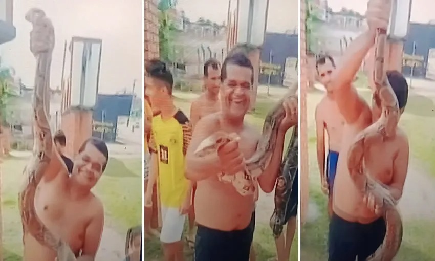 O borracheiro decidiu capturar a cobra com a ajuda de amigos. Ele fez um vídeo do momento em que levou a jiboia para uma área de matagal, onde a deixou à vontade.