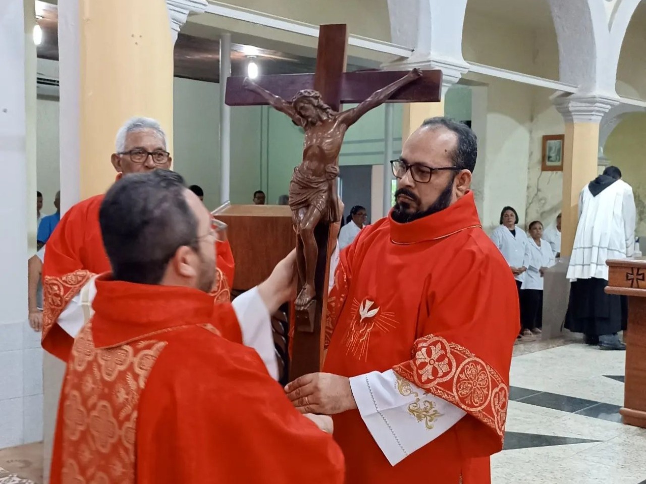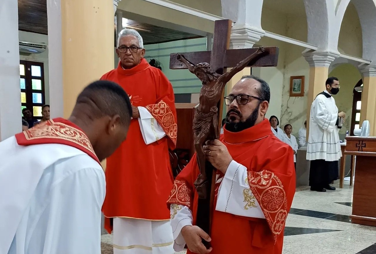Logo em seguida, aconteceu a Adoração da Cruz, um momento em que os fiéis se aproximam da imagem de Cristo crucificado para expressar sua devoção e veneração. O Frei Moisés conduziu a cerimônia com muita solenidade e reflexão, lembrando aos fiéis a importância da cruz como símbolo do amor de Deus por toda a humanidade.