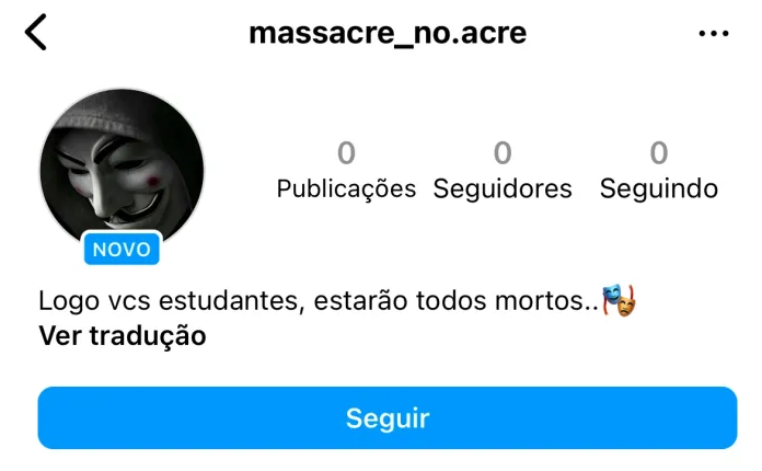 No entanto, a situação tem se agravado ainda mais com a criação de um perfil falso nas redes sociais, que tem deixado os acreanos preocupados. A conta no Instagram @massacre_no.acre, com zero seguidores e nenhuma publicação, contém a ameaça de um ataque a estudantes na bio: “Logo vcs estudantes, estarão todos mortos”.