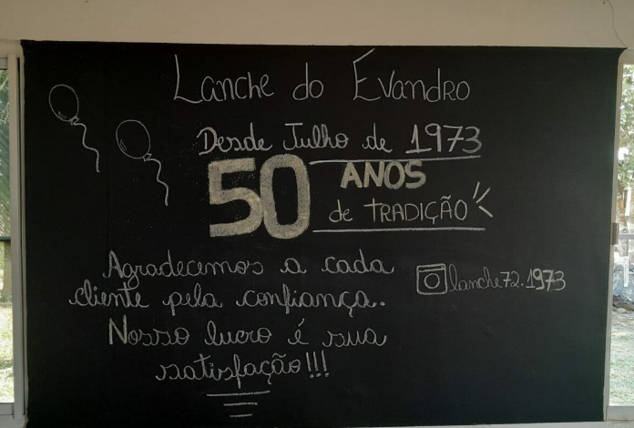Para celebrar essa data especial, o Lanche do Evandro foi ornamentado com uma decoração comemorativa, e uma placa de agradecimento foi instalada, expressando a gratidão a cada cliente pela confiança ao longo desses 50 anos de trajetória: “Agradecemos a cada cliente pela confiança. Nosso lucro é a sua satisfação”, diz o enunciado.