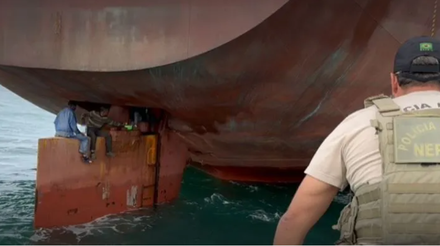 A Policia Federal (PF) resgatou, nesta segunda-feira (10), quatro pessoas que estavam no leme de um navio que saiu de Lagos, na Nigéria, em 27 de junho. (Veja o vídeo abaixo).
