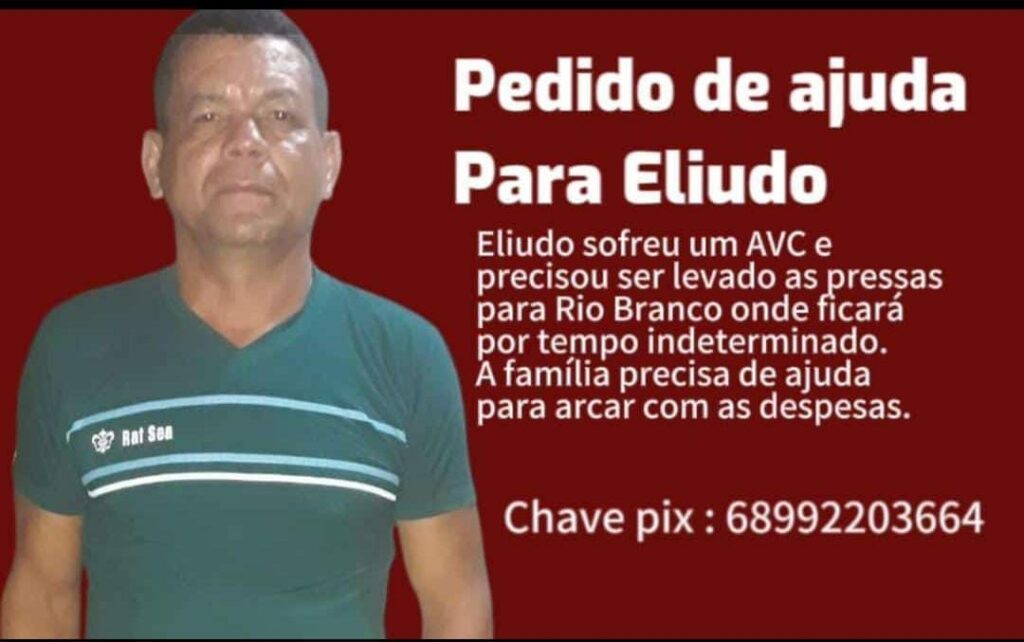 Eliudo de Souza Bandeira, de 49 anos, um vendedor de pipocas residente no bairro da Vitória em Sena Madureira, encontra-se atualmente internado na Unidade de Tratamento Intensivo (UTI) em Rio Branco. Há aproximadamente 12 dias, ele foi vítima de um acidente vascular cerebral (AVC) e desde então tem enfrentado uma batalha pela sua saúde.