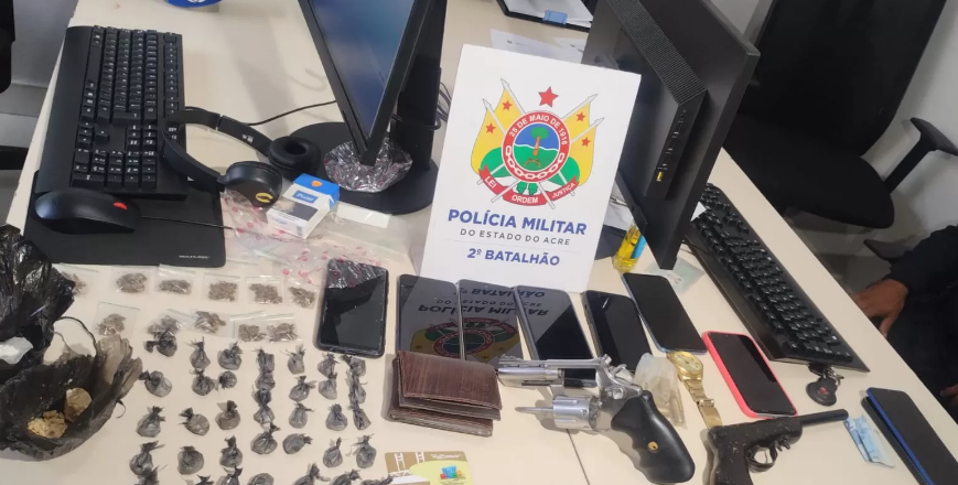 Na sequência de um arrastão ocorrido no bairro Cidade Nova, em Rio Branco, a atuação eficaz dos Policiais Militares do 2° Batalhão culminou na prisão de Erlan da Costa Macedo, de 23 anos, e na apreensão de dois adolescentes, um de 16 anos e outro de 17 anos. Os indivíduos foram detidos por crimes de roubo, porte ilegal de arma de fogo e tráfico de drogas durante uma operação no bairro Boa Vista, na região da Baixada da Sobral.