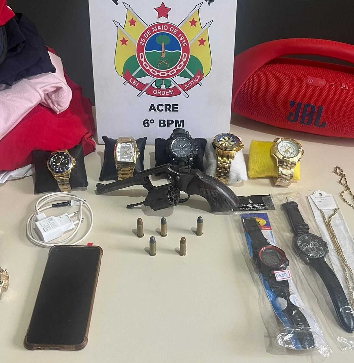 Ao chegar ao estabelecimento, a vítima informou que dois indivíduos haviam entrado na loja, sendo que um deles estava armado. Eles roubaram diversos objetos e fugiram em direção a uma área de mata. Posteriormente, a guarnição foi informada de que os suspeitos foram detidos por militares do exército em uma área restrita. Surpreendentemente, os indivíduos eram menores de idade e estavam na posse de uma arma de fogo calibre .38.