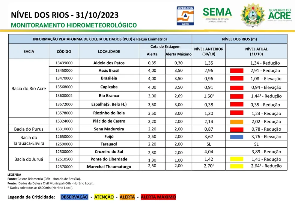 Nesta terça-feira, 31 de outubro, o Acre mantém sete pontos de monitoramento em estado de alerta máximo devido à seca dos rios, de acordo com os dados divulgados pela Defesa Civil estadual e a Secretaria Estadual de Meio Ambiente (Sema). Dentre os municípios em alerta, estão Assis Brasil, Brasiléia, Capixaba, Rio Branco e Sena Madureira, além dos pontos de monitoramento do Ramal Espalha (na região do Seringal Belo Horizonte) e Riozinho do Rola, também na capital, todos registrando níveis abaixo das cotas de alerta e alerta máximo.