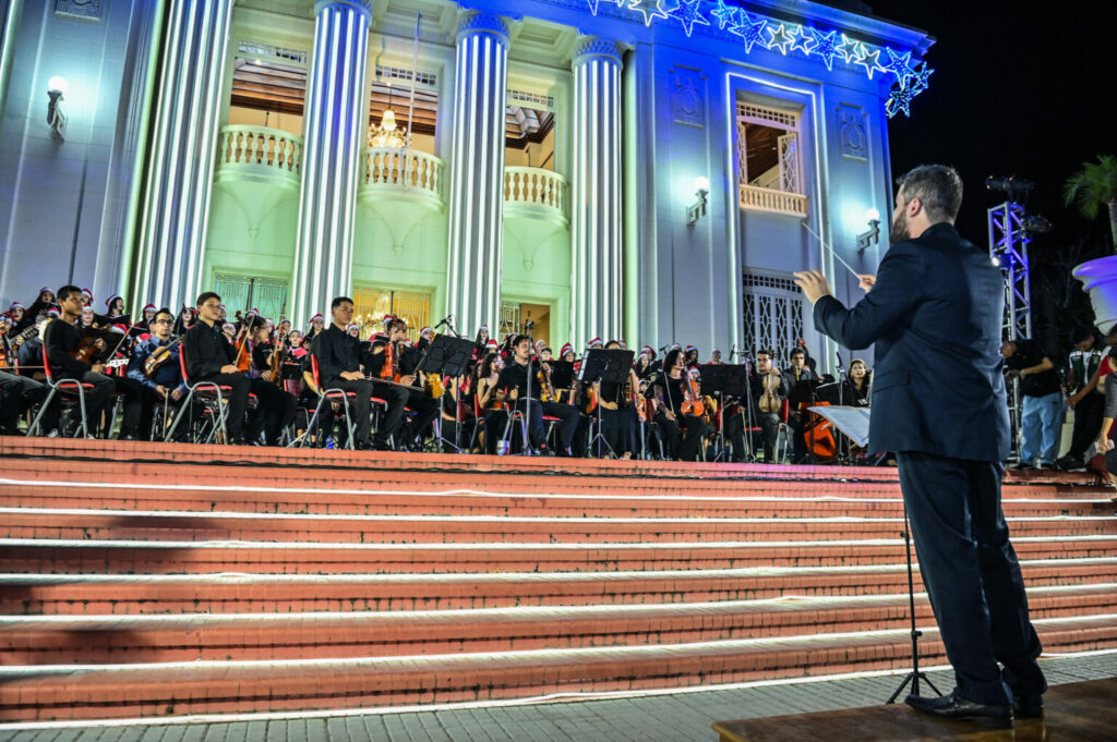 Mais de 135 músicos, incluindo estudantes, professores da Escola de Música Acreana e participantes da comunidade, fizeram parte da performance, encantando o público com canções tradicionais do período natalino. A cerimônia também marcou o acendimento das luzes do Palácio Rio Branco e contou com a apresentação do DJ Black e do saxofonista Samuel.