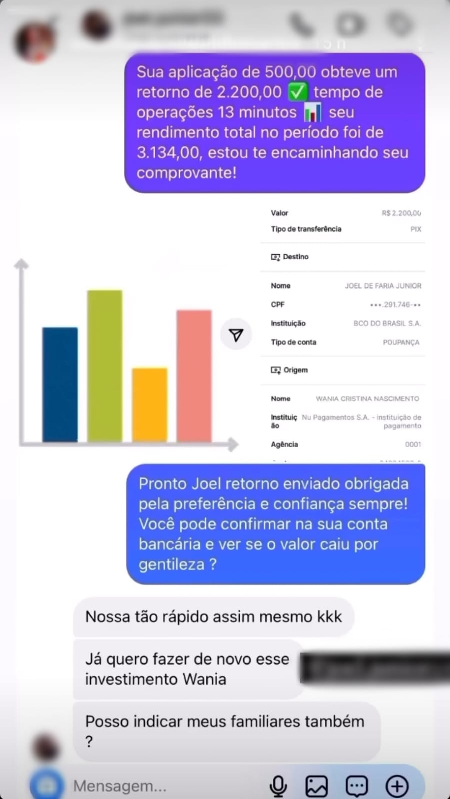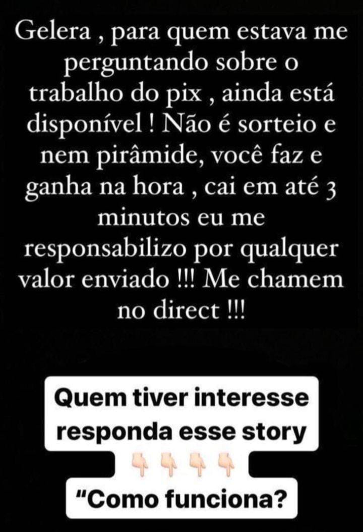 A vítima afirma ter sido abordada por meio de redes sociais, onde foi apresentada a proposta de investir um determinado valor em troca de lucros rápidos e expressivos. A abordagem consistia em uma suposta “tabela PIX”, onde a pessoa deveria realizar depósitos consecutivos para, segundo os golpistas, multiplicar o montante investido.