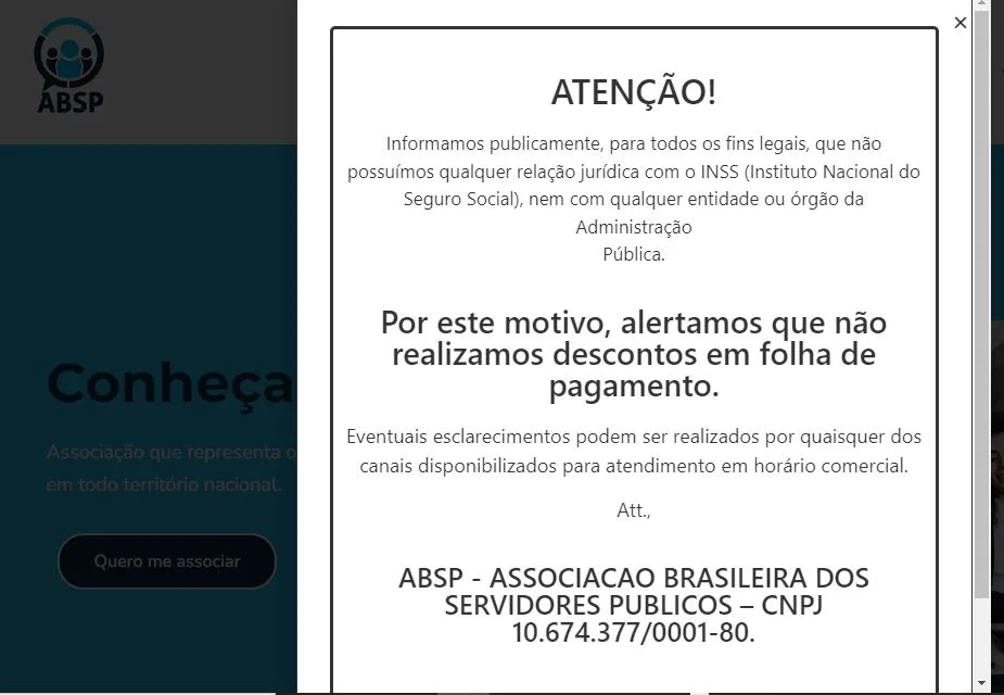 Os criminosos empregam diversas entidades para aplicar o golpe, sendo a Associação Brasileira dos Servidores Públicos (ABSP) uma das mais utilizadas. No entanto, ao acessar o site dessa instituição, é exibido um alerta destacando que não há qualquer relação jurídica com o INSS ou qualquer órgão da Administração Pública, e que portanto não realizam descontos em folha de pagamento.