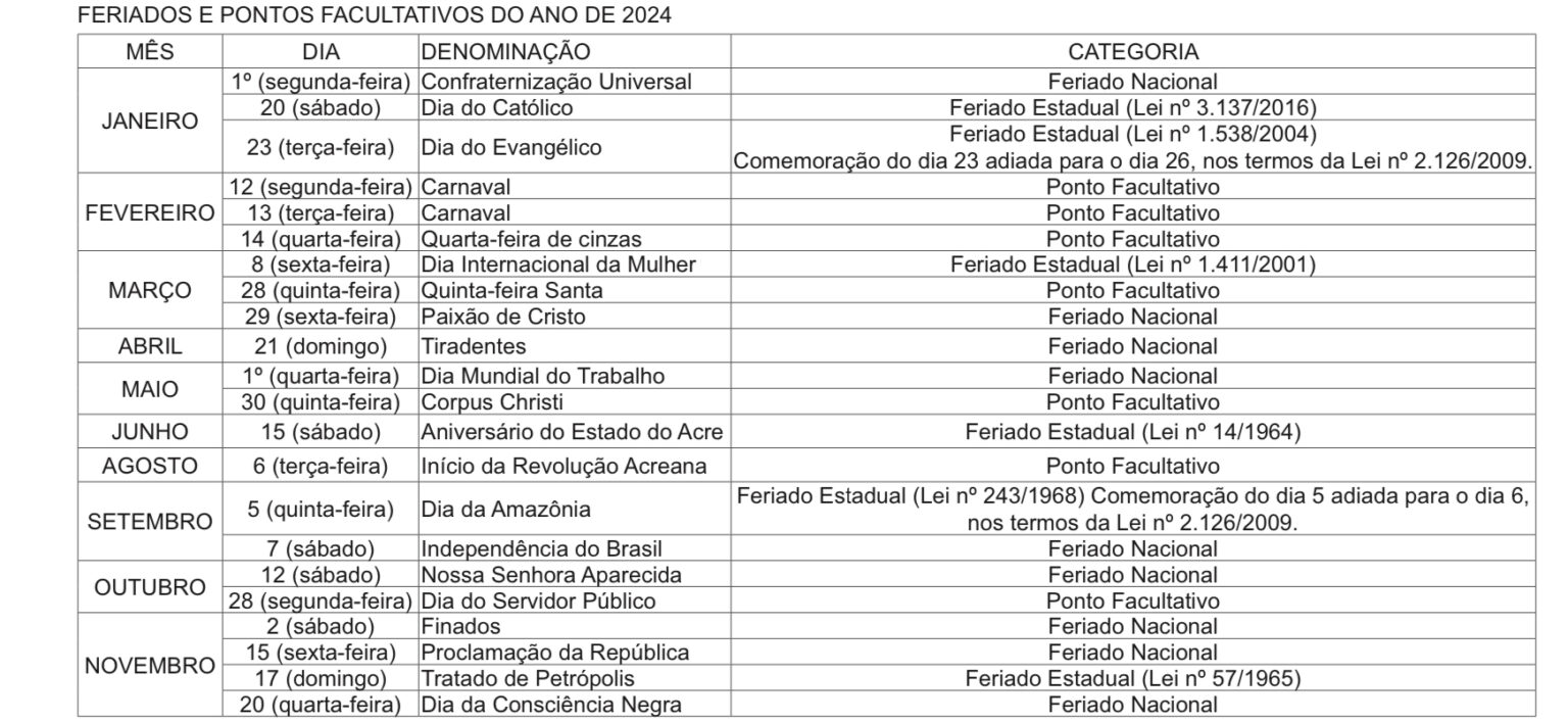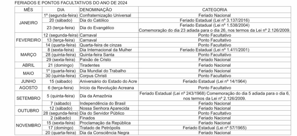Nesta quinta-feira (4), o governador Gladson Cameli, por meio de decreto publicado no Diário Oficial do Estado (DOE), delineou o calendário de feriados e pontos facultativos para os servidores públicos ao longo de 2024.