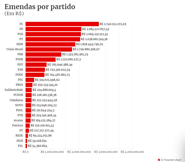O levantamento, com base em dados do portal Siga Brasil do Senado Federal, revela que o PL lidera o ranking, seguido pelo Partido Progressistas (PP) com R$ 2,08 bilhões. Na sequência, aparecem o Partido Social Democrático (PSD) e o Partido dos Trabalhadores (PT), ambos com R$ 2 bilhões.