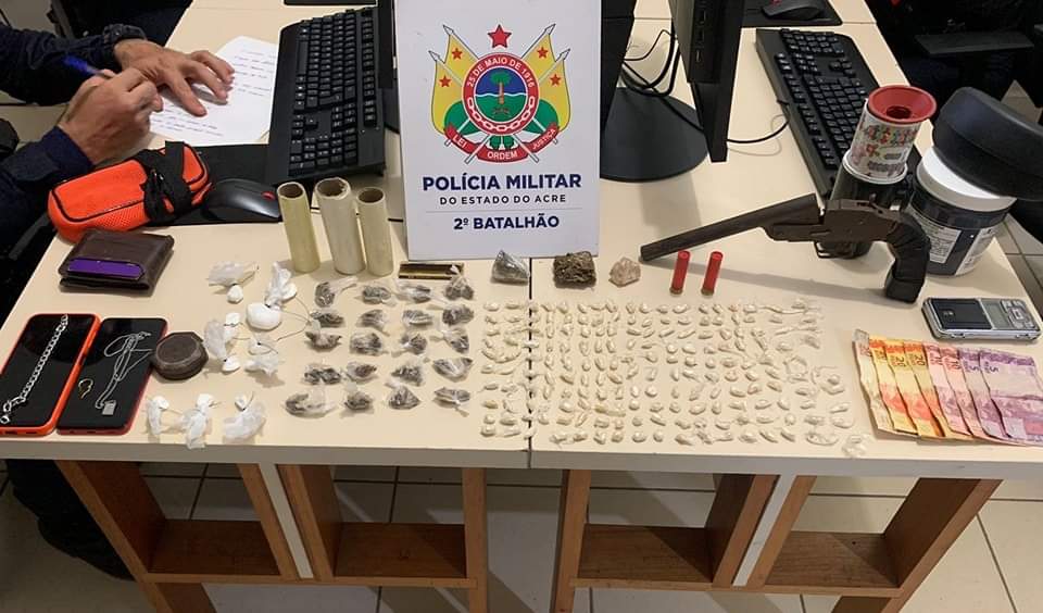 A segunda ocorrência foi na travessa Dourado, no mesmo bairro, e se tratava de uma denúncia de que dois indivíduos estariam embalando e comercializando entorpecentes. Uma guarnição foi ao local e prendeu em flagrante os dois homens, que estavam com uma arma de fogo de fabricação artesanal, com duas munições, além de 170 invólucros de skank, 22 de maconha e 10 de cocaína.