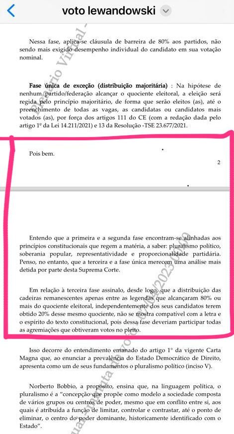 O voto do ministro relator, Ricardo Lewandowski, já conta com o apoio de outros dois ministros, Alexandre de Moraes e Gilmar Mendes. O relator entende que a mudança se aplica apenas aos deputados federais que foram eleitos sem terem alcançado a cláusula de barreira pessoal, que é de 20% do quociente eleitoral.