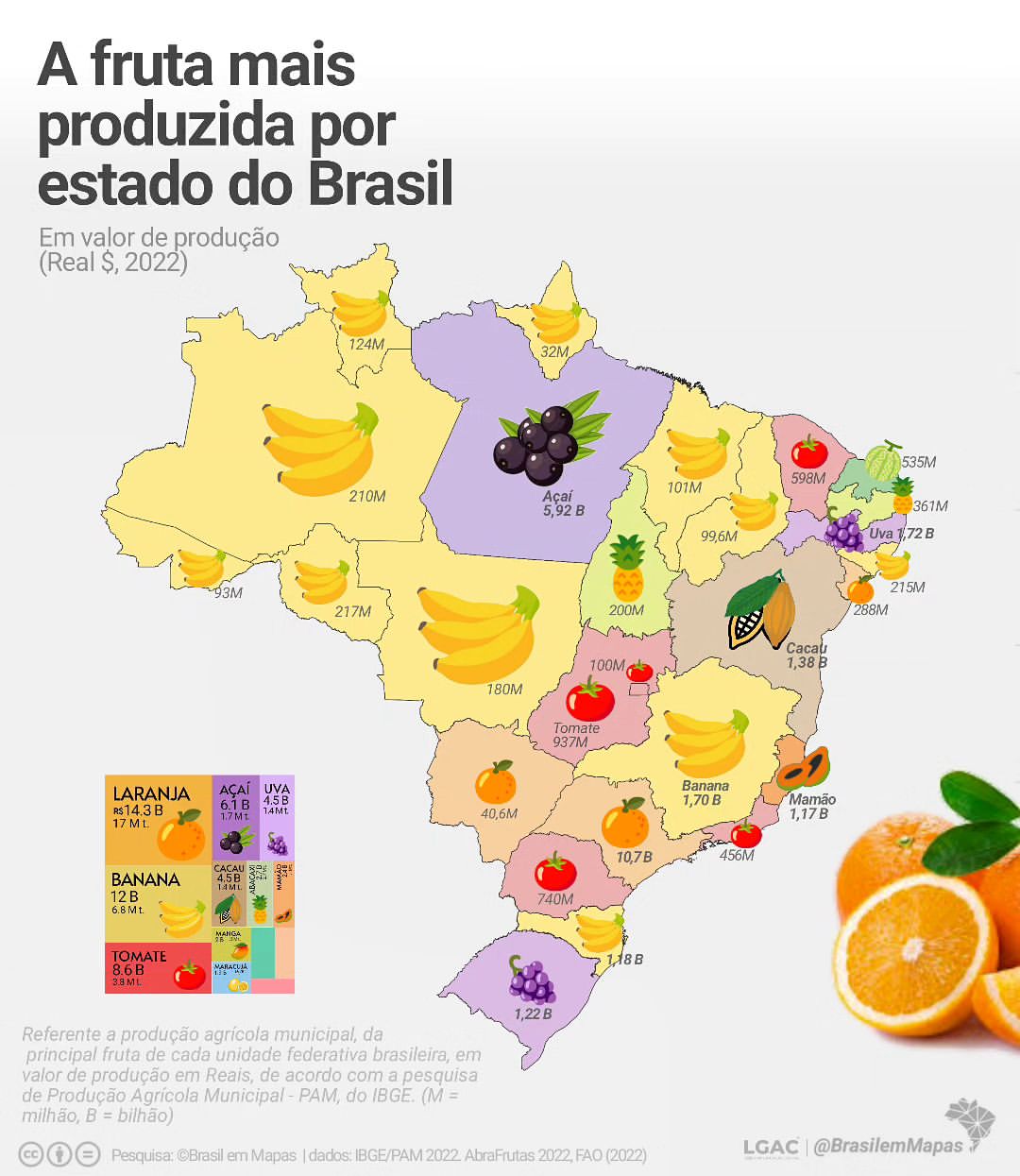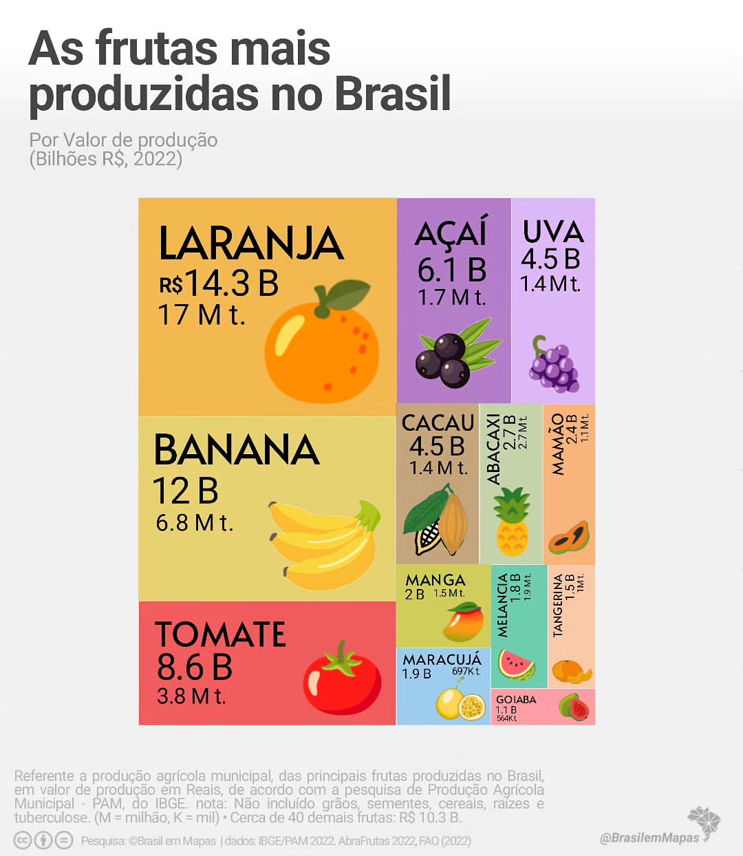 A diversidade da produção de frutas no Brasil é notável, abrangendo desde frutas amplamente conhecidas, como banana, laranja, uva e tomate, até variedades típicas como açaí, jabuticaba, guaraná e graviola. Apesar do expressivo volume de exportações, o mercado interno ainda continua sendo uma prioridade para o país.