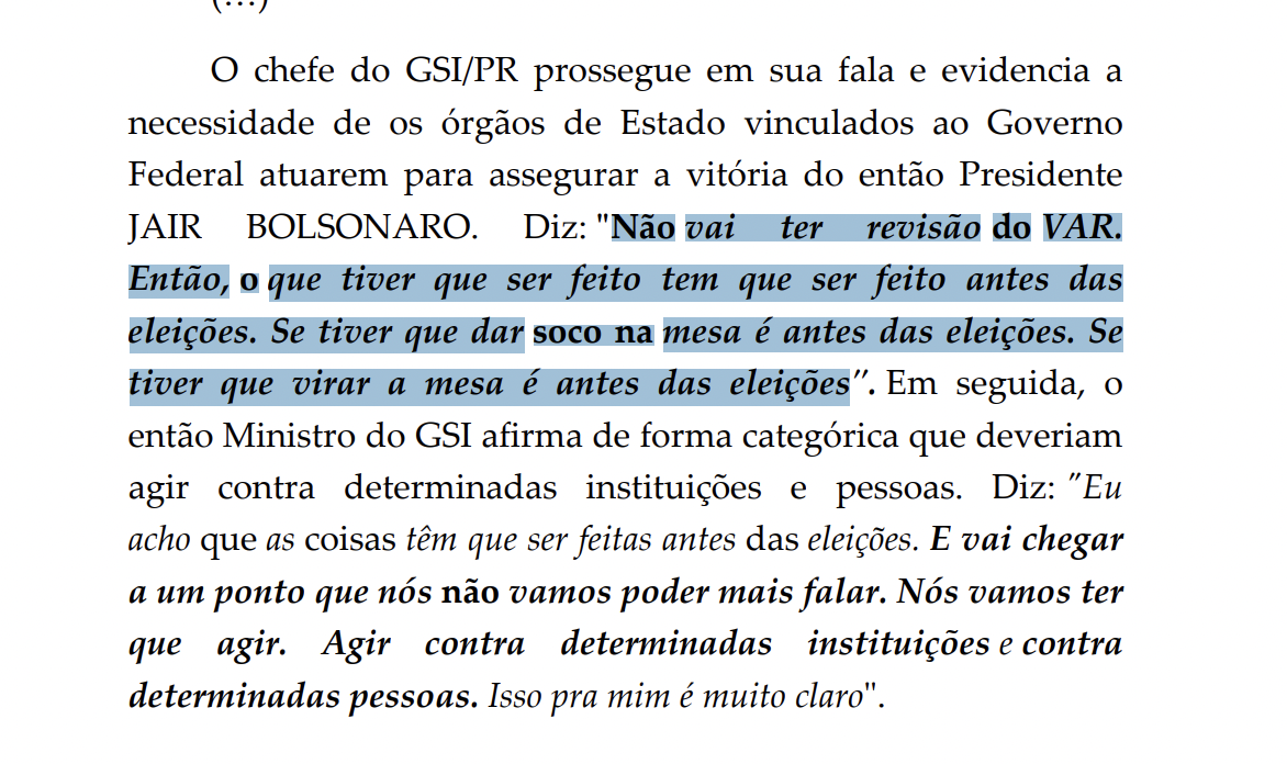 “Não vai ter revisão do VAR. Então, o que tiver que ser feito tem que ser feito antes das eleições. Se tiver que dar soco na mesa é antes das eleições. Se tiver que virar a mesa é antes das eleições“, afirmou o ministro do Gabinete de Segurança Institucional na reunião.