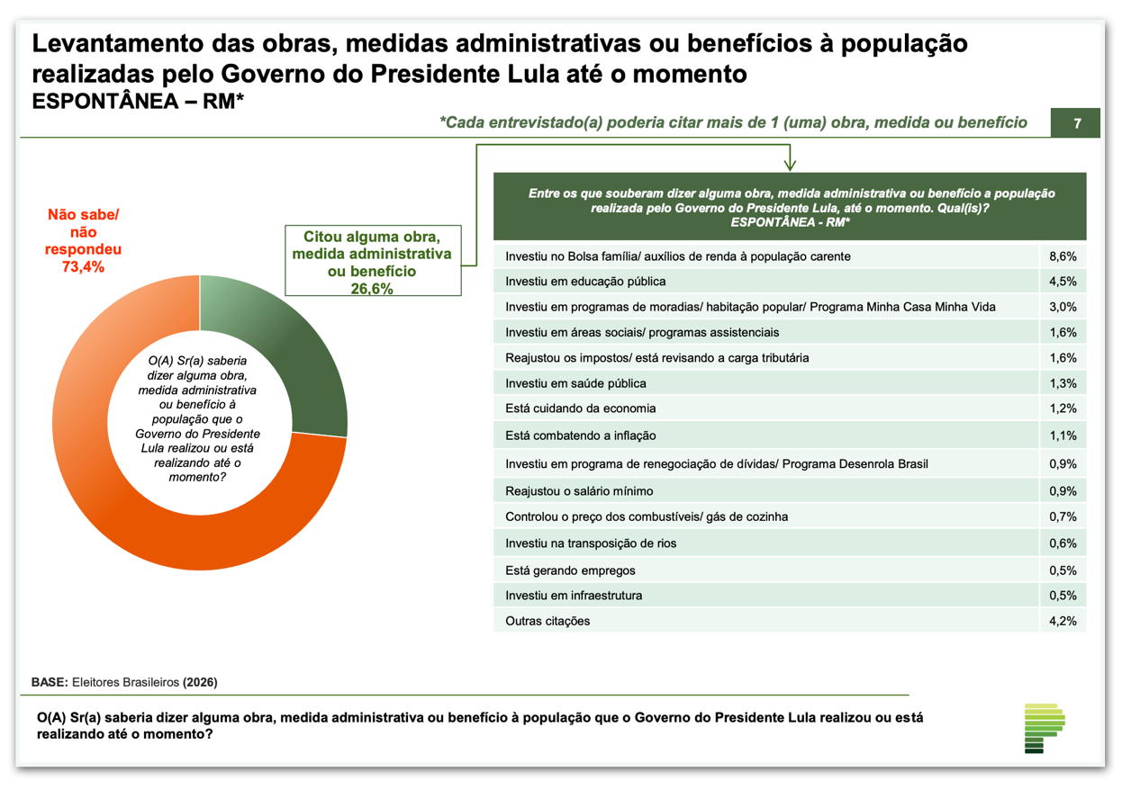 - 73,4% dos entrevistados admitiram não conseguir citar nenhuma medida, benefício ou obra realizada ou em andamento durante o governo Lula.