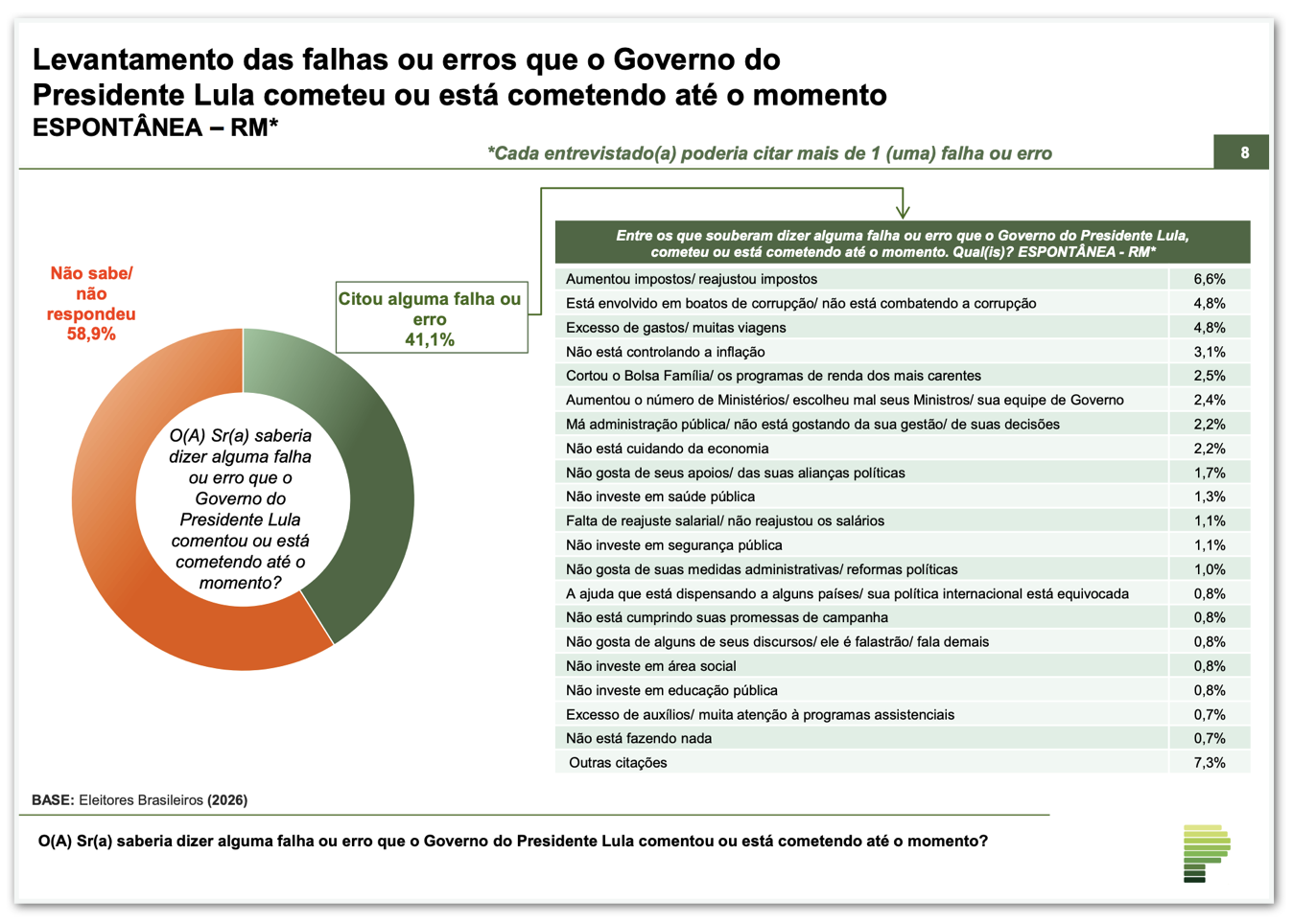 - Quase 59% dos entrevistados afirmaram não saber mencionar nenhum erro cometido pela administração de Lula.