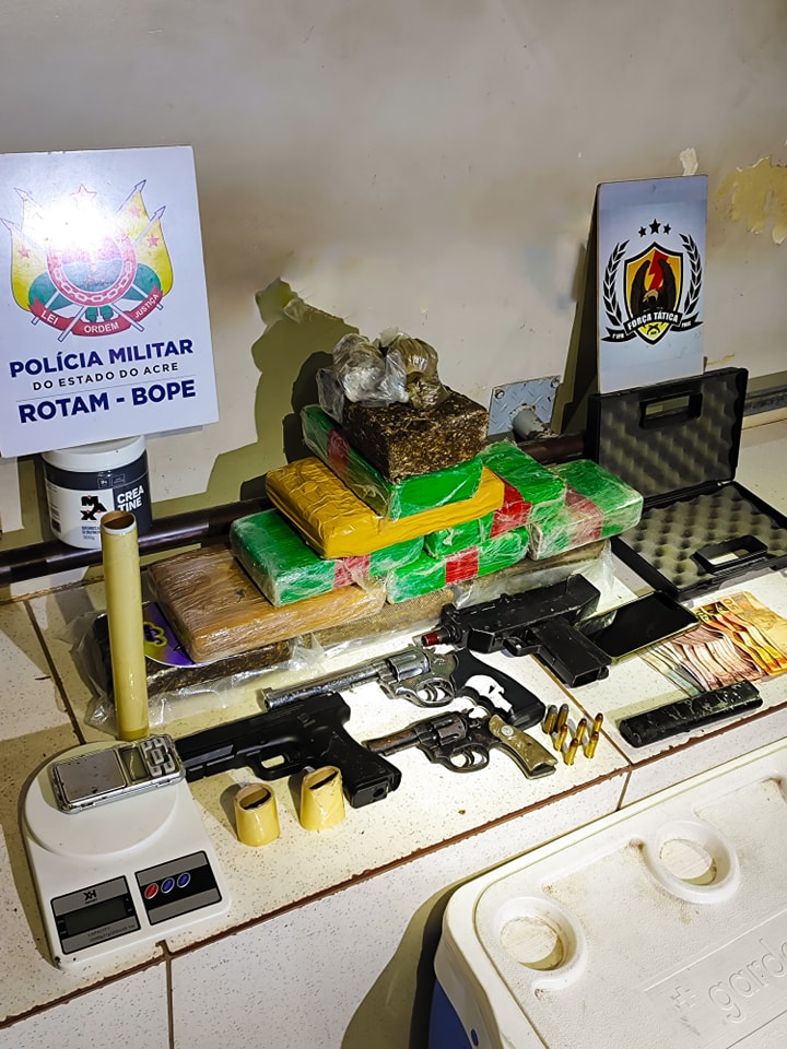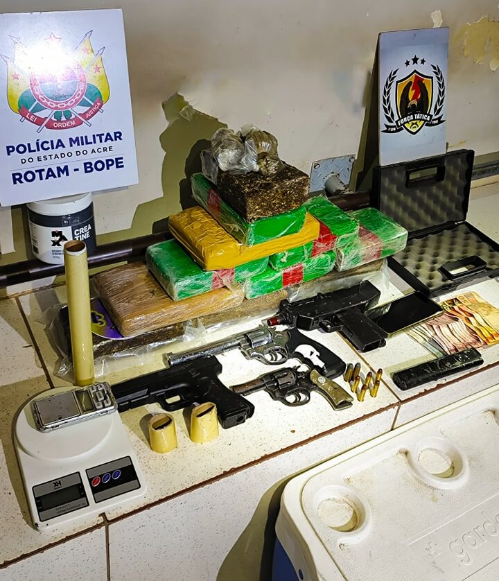 Ação conjunta das equipes de Rondas Ostensivas Tático Móvel (Rotam) e da Força Tática do 1° Batalhão resultou neste sábado, 3, na desarticulação de uma “boca de fumo” no bairro da Paz, em Rio Branco. Um homem foi preso, três armas de fogo, um simulacro de pistola e drogas foram apreendidos no local.