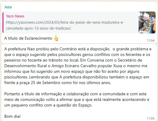 Segundo os piscicultores, a Prefeitura de Sena Madureira deu parecer negativo para o local escolhido para a feira, mesmo com as tendas já montadas. Uma tentativa de encontrar um local alternativo também foi negada.