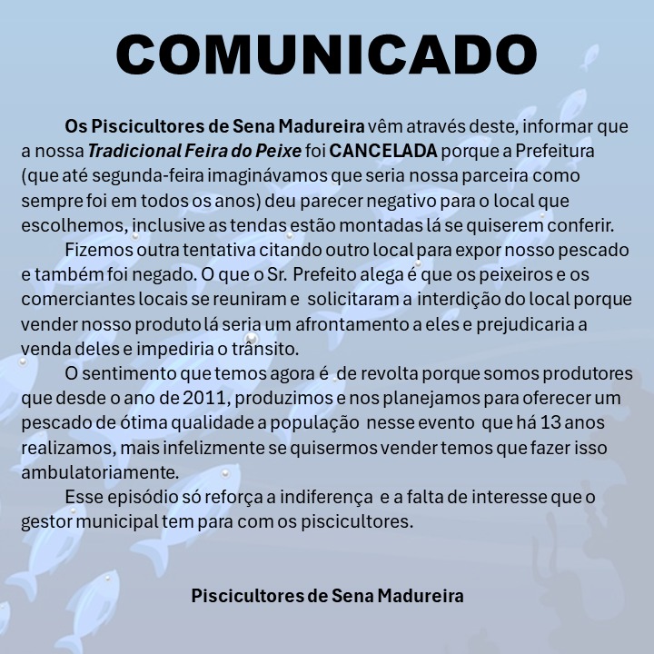 A tradicional Feira do Peixe de Sena Madureira, que aconteceria neste ano de 2024, foi cancelada pelos piscicultores do município. A feira, que já existia há 13 anos, era uma importante fonte de renda para os produtores locais e um evento cultural para a cidade.