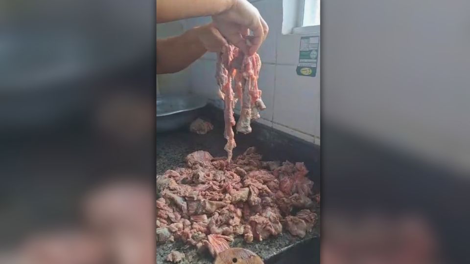 “Nossas condições de trabalho são essas. A carne que chega para a escola é desse jeito. Não é só hoje, é sempre assim”, lamenta a servidora no vídeo.