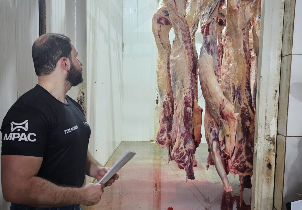 No interior do frigorífico, o MPAC, acompanhado pela equipe do IDAF, verificou a higienização e esterilização do local de abate, o armazenamento da carne na câmara fria e a separação da carne industrial.