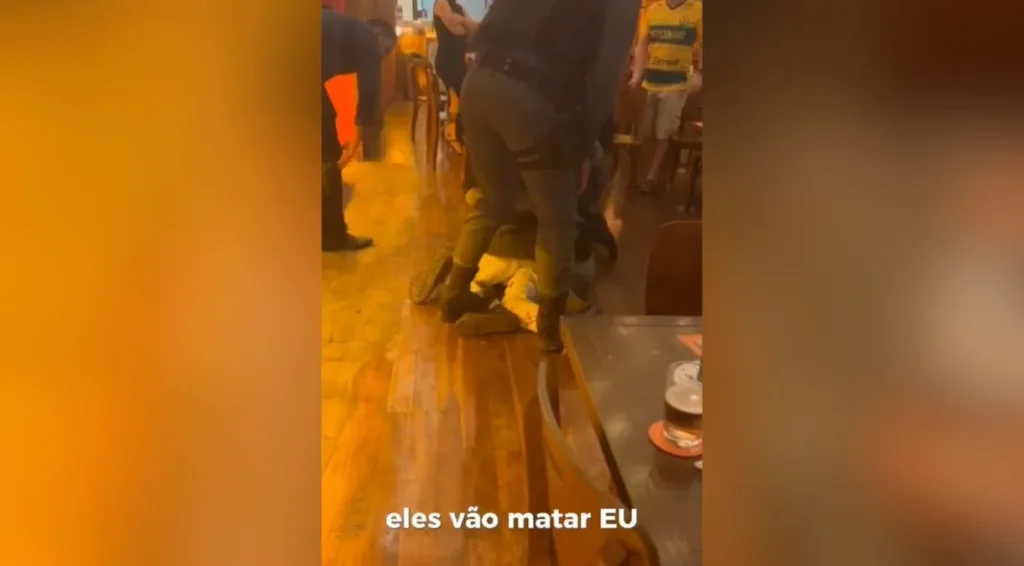 Em um vídeo divulgado e viralizado nas redes sociais, é possível ver o momento em que o homem em situação de rua grita enquanto está imobilizado no chão do estabelecimento por policiais militares que foram até o local.