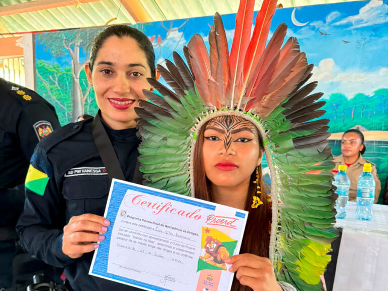 A Polícia Militar do Acre (PMAC) realizou nesta terça-feira, 23, uma formatura do Programa Educacional de Resistência às Drogas e à Violência (Proerd) na Escola Estadual Indígena Estirão do Caucho, localizada na Aldeia do Caucho, em Tarauacá. O evento marcou a primeira vez que o programa foi implementado em uma escola indígena na região, formando 45 alunos após duas semanas de curso intensivo.