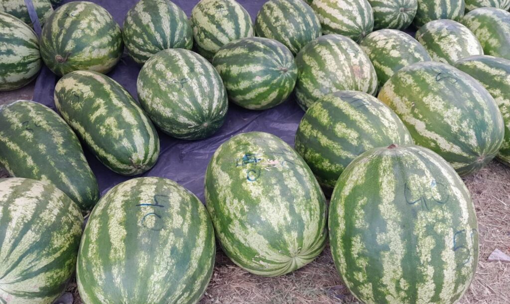 Os preços das melancias variam conforme o tamanho. As maiores são vendidas por até 50 reais, enquanto outras podem ser encontradas por 15, 20 reais e assim por diante.