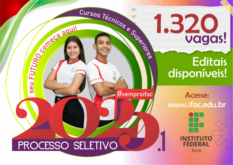 O Instituto Federal do Acre (Ifac) publicou, nesta quarta-feira (09.10), os editais do Processo Seletivo 2025/1 de cursos técnicos e superiores. Ao todo, estão sendo ofertadas 1320 vagas para os campi Rio Branco, Baixada do Sol (Transacreana), Cruzeiro do Sul, Sena Madureira, Tarauacá e Xapuri. O prazo de inscrições terá início no dia 14 de outubro.