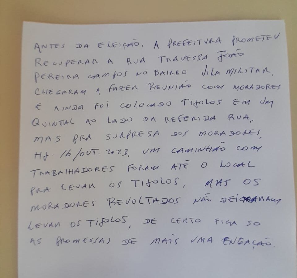 Em Sena Madureira, a promessa da Prefeitura de recuperar a Rua Travessa João Pereira Campos, no bairro Vila Militar, gerou frustração e revolta entre os moradores. Antes da eleição, a administração municipal havia se comprometido com a revitalização da via, promovendo reuniões com os residentes e iniciando a colocação de tijolos em um quintal adjacente à rua.