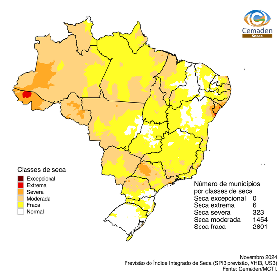 Segundo o Índice Integrado de Seca (IIS3), que monitora essas condições, existe a possibilidade de uma redução no número de municípios classificados com seca severa e extrema até o final de novembro. A previsão é de uma melhora gradual na situação em todo o território nacional.