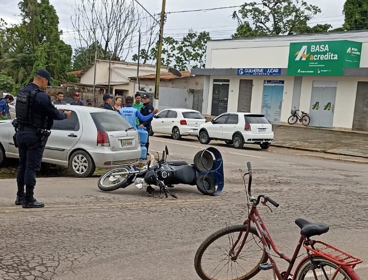 Na manhã desta sexta-feira (13), um acidente de trânsito envolvendo um carro e uma motocicleta chamou atenção de moradores na rua Quintino Bocaiuva, região central de Sena Madureira, próximo à ladeira do hospital.