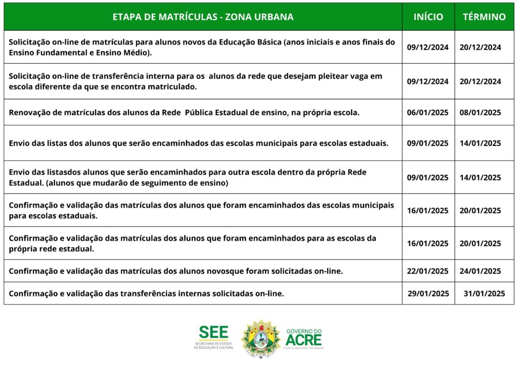 A Secretaria de Estado de Educação e Cultura (SEE) do Acre anunciou o calendário de matrículas e rematrículas para o ano letivo de 2025 nas escolas da rede estadual. A Instrução Normativa n.º 07/2024 detalha as orientações e o cronograma para a Educação Básica (Ensino Fundamental e Médio), Educação de Jovens e Adultos, Educação Indígena e Educação do Campo.