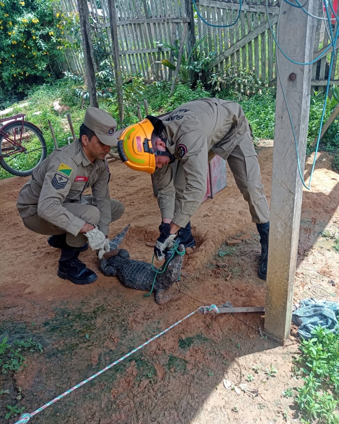 Nesta quinta-feira (9), o Corpo de Bombeiros de Sena Madureira realizou o resgate de um jacaré que invadiu o quintal de uma residência localizada na rua Manoel Gonçalves, no bairro do Bosque.