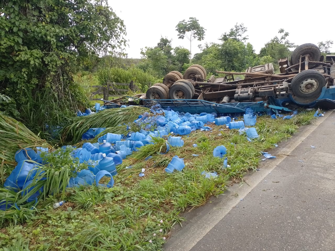 Na manhã deste sábado (22), um caminhão que transportava galões de água mineral sofreu um acidente na BR-364, entre Rio Branco e Sena Madureira, no Acre.