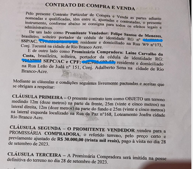 Uma moradora de Rio Branco denunciou ter sido vítima de um golpe de estelionato ao tentar adquirir um terreno. Segundo o relato, em setembro de 2023, Laíne encontrou um terreno à venda na plataforma OLX, localizado no loteamento Joafra. O vendedor, identificado como Felipe Menezes, alegou que precisava vender o imóvel com urgência para comprar gado. Ele apresentou o local cercado e possuía a chave do cadeado, o que levou Laíne a confiar na oferta e realizar a compra por R$ 30 mil à vista, um valor presenteado por seu pai.