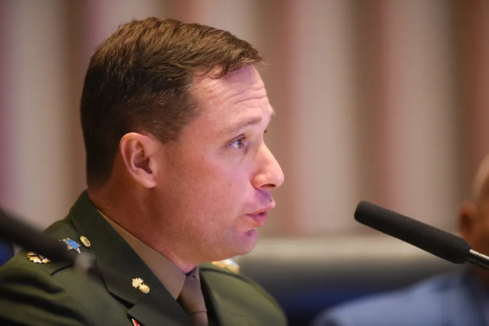 Tenente Coronel Mauro Cid durante depoimento na CPI. Nesta quinta (24) a CPI do 8 de Janeiro do Distrito Federal (DF) ouve o Tenente Coronel Mauro Cid ex ajudante de ordem do Ex-Presidente Jair Bolsonaro — Foto: TON MOLINA/FOTOARENA/FOTOARENA/ESTADÃO CONTEÚDO