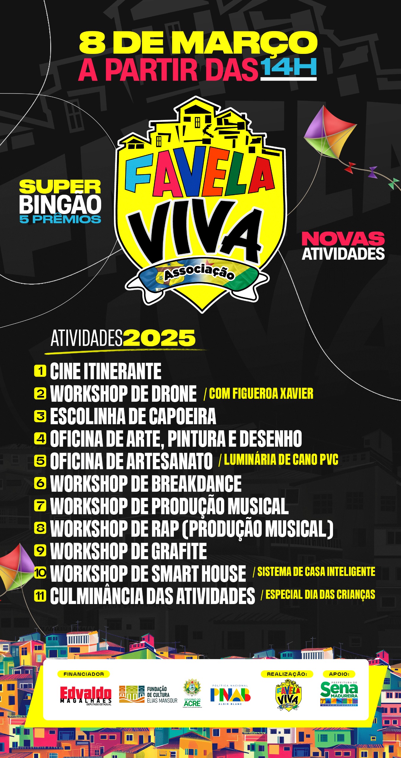 A Associação Favela Viva, de Sena Madureira, realizará no dia 8 de março, a partir das 14h, o lançamento de suas ações anuais. O evento acontecerá no Bairro da Vitória, na Rua Aurino Brito, e contará com diversas atividades culturais e um grande bingão com cinco prêmios.
