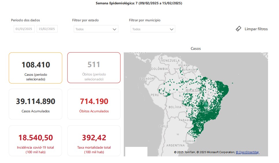 O Brasil registrou 108.410 novos casos de Covid-19 em 2025, considerando o período de 1° de janeiro a 15 de fevereiro. O intervalo corresponde às sete primeiras semanas epidemiológicas (SE) deste ano e representa uma alta de 52% ante os 71.479 registrados nas últimas sete semanas epidemiológicas de 2024, que engloba o período entre os dias 8 de novembro e 28 de dezembro. Os dados são do painel do Painel da Covid-19 no Brasil, do Ministério da Saúde.