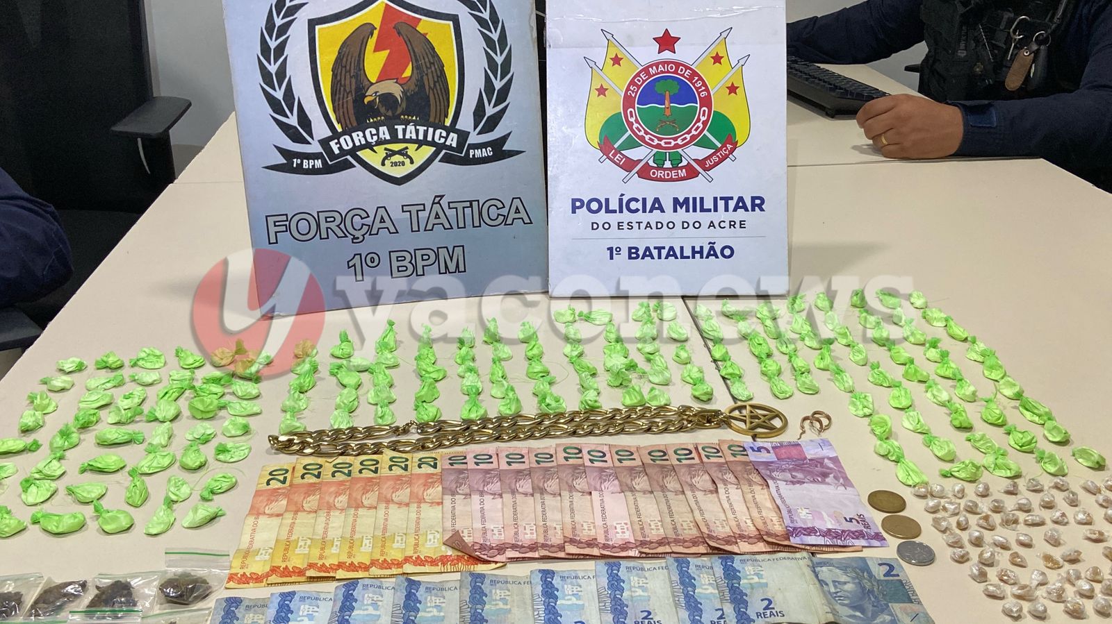 Após uma consulta via sistema de segurança, foi revelado que tratava-se de um adolescente de 16 anos. Ao realizar a busca pessoal, o rapaz portava uma bolsa tipo pochete que, no seu interior foi encontrado 166 trouxinhas de substâncias entorpecentes análoga à cocaína, 12 sacos de Skank, 72 pedras de Crack e 236 reais em dinheiro.