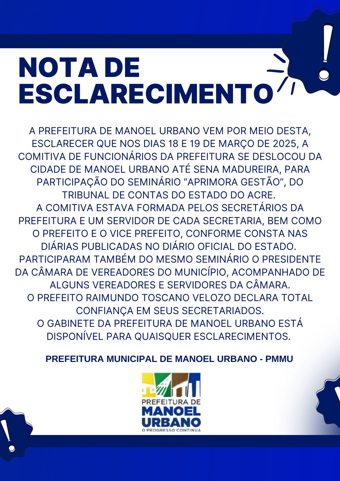 Na nota, a Prefeitura informa que, nos dias 18 e 19 de março de 2025, uma comitiva de funcionários da gestão municipal se deslocou até Sena Madureira para participar do seminário “Aprimora Gestão”, promovido pelo Tribunal de Contas do Estado do Acre. A Prefeitura destaca que a comitiva era composta pelos secretários municipais, um servidor de cada secretaria, além do prefeito e do vice-prefeito, conforme registros publicados no Diário Oficial do Estado.