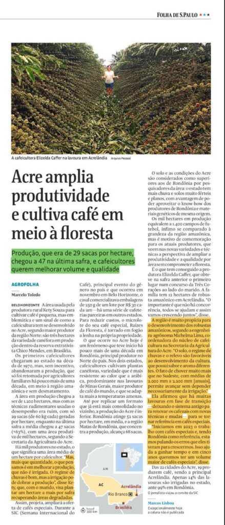 A reportagem, assinada por Marcelo Toledo e publicada no caderno Agrofolha, destaca a Fazenda da produtora rural Kety Souza, localizada em Brasileia, na Reserva Extrativista Chico Mendes. Com apenas três hectares destinados ao cultivo de café da variedade canéfora, Kety tem utilizado técnicas sustentáveis e exemplificado o crescimento da cafeicultura na região, sem causar impactos ambientais, como desmatamento.