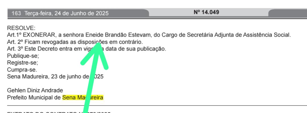 A edição do Diário Oficial do Município de Sena Madureira desta terça-feira, 24 de junho de 2025, trouxe a exoneração de Eneide Brandão Estevam do cargo de Secretária Adjunta de Assistência Social. O decreto, assinado pelo prefeito Gerlen Diniz no dia 23, não traz justificativas, como é de praxe, mas bastidores políticos apontam um possível motivo para a medida.