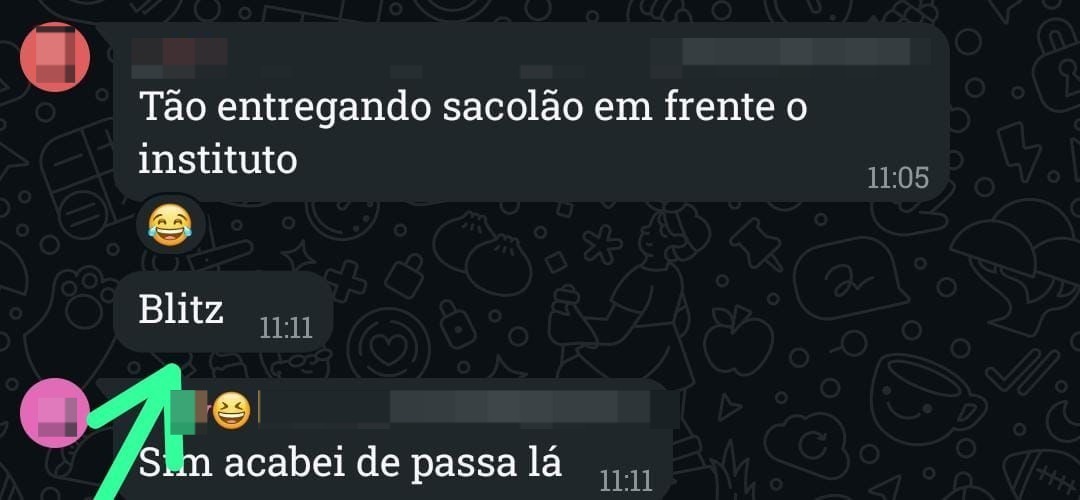 Um dos membros do grupo divulgou, por volta das 11h05, que estavam entregando “sacolão” (cestas básicas) em frente ao Instituto Santa Juliana. A mensagem, fora de contexto e sem verificação, levou algumas pessoas ao local na esperança de receber os alimentos. No entanto, logo abaixo, outra mensagem enviada às 11h11 esclarecia: “Blitz”.