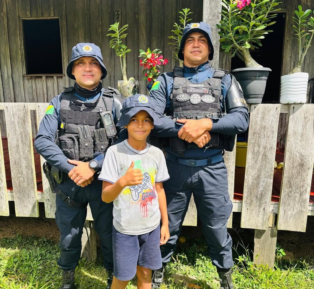 A manhã desta quinta-feira, 6 de junho, foi especial para o pequeno Miguel Silva do Vale, de apenas 8 anos, morador do km 17 da Estrada Mário Lobão, zona rural de Sena Madureira. Admirador da Polícia Militar, Miguel recebeu a visita surpresa da equipe da Patrulha Comunitária Rural do 8º Batalhão, que realizou uma ação de aproximação com a comunidade.