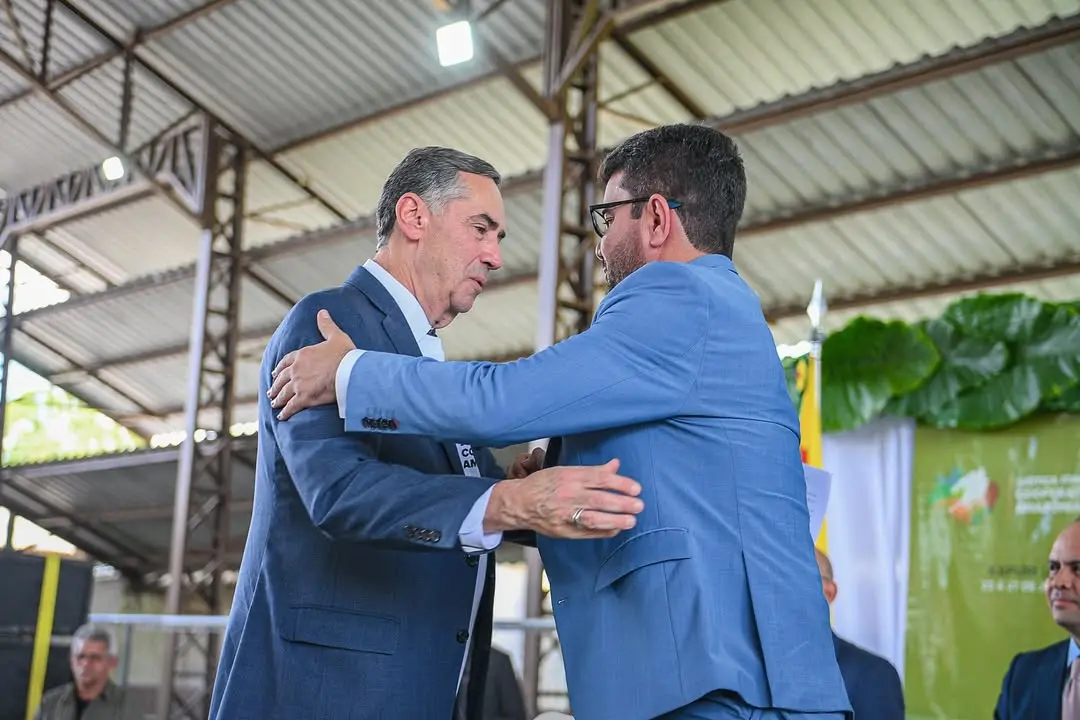 O governador do Acre, Gladson Cameli (PP), recebeu na manhã desta sexta-feira (27) o presidente do Supremo Tribunal Federal (STF) e do Conselho Nacional de Justiça (CNJ), ministro Luís Roberto Barroso, em Xapuri, durante o encerramento do programa Justiça Itinerante Cooperativa na Amazônia Legal.