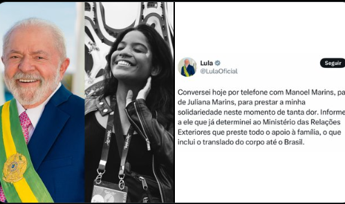 “Conversei hoje por telefone com Manoel Marins, pai de Juliana Marins, para prestar a minha solidariedade neste momento de tanta dor. Informei a ele que já determinei ao Ministério das Relações Exteriores que preste todo o apoio à família, o que inclui o translado do corpo até o Brasil”, escreveu Lula.