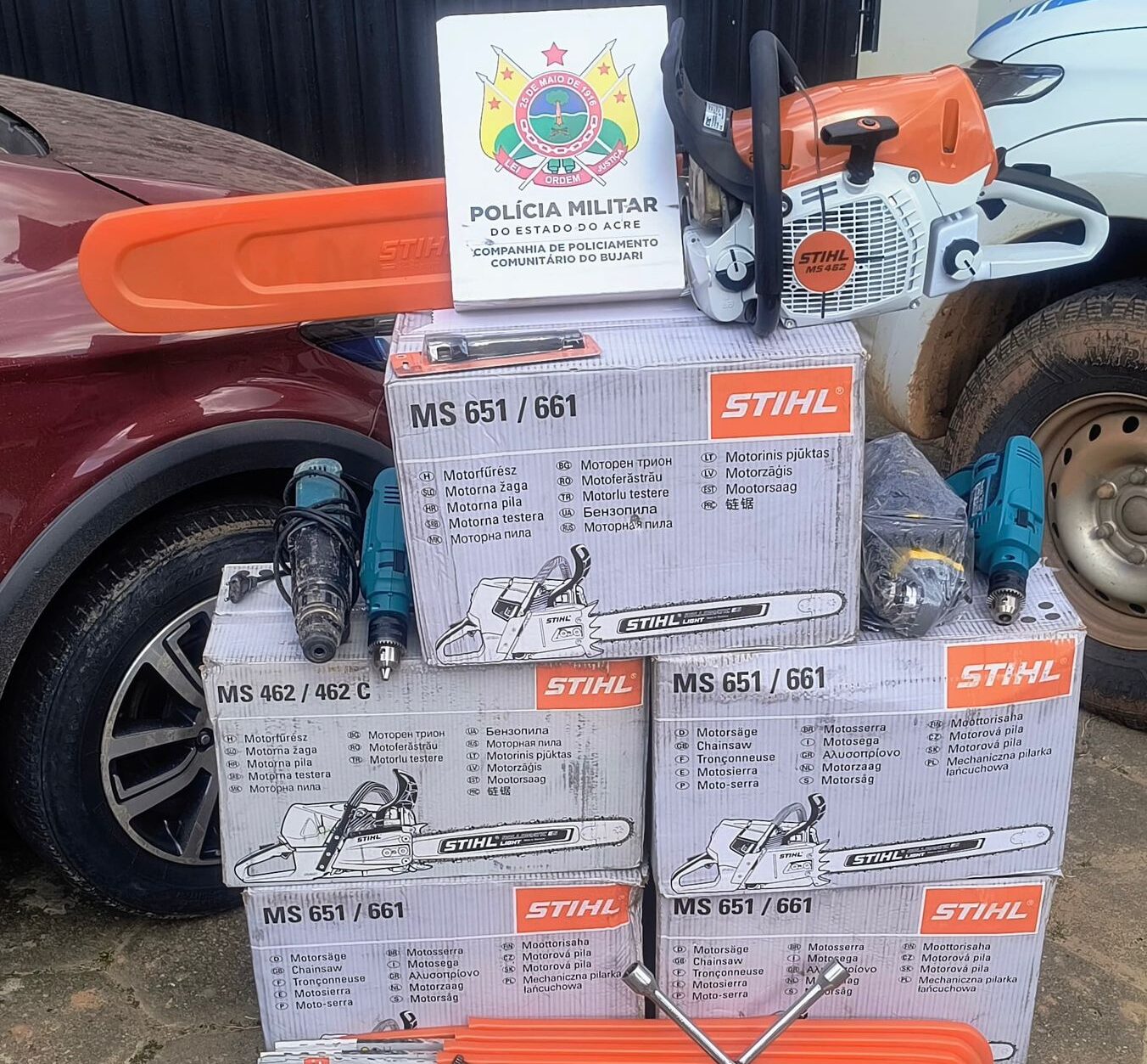 Pouco tempo depois, o carro com as descrições informadas passou pelo local e foi abordado. Durante a revista, os policiais encontraram diversas motosserras no interior do veículo. O condutor alegou que os equipamentos eram de sua propriedade, e como não havia, naquele momento, provas que contradissessem a versão, ele foi liberado.