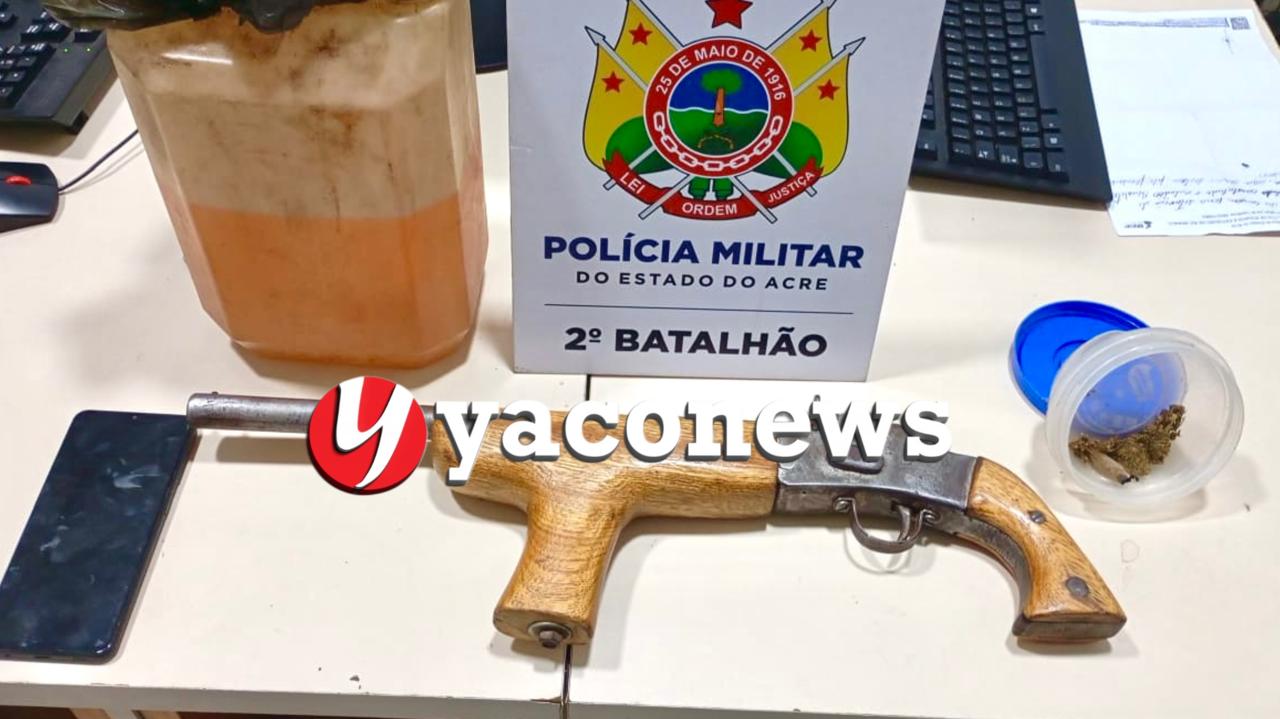 No local os policiais encontraram uma arma de fogo do tipo escopeta, a famosa “Bocuda”, um galão contendo gasolina, que a polícia acredita que seria utilizado para incendiar alguma casa, é uma quantidade de maconha.
