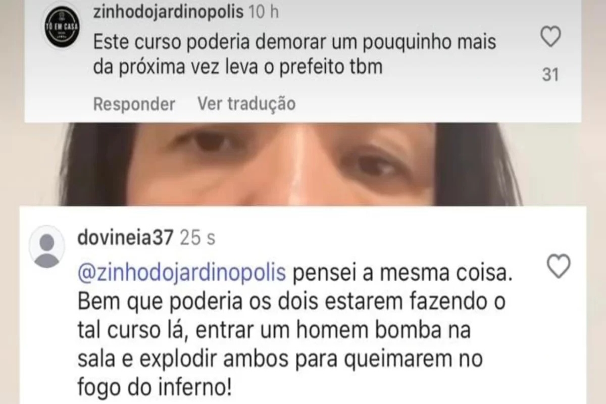 Em resposta, um perfil, identificado como “dovineia37” concordou, completando que “bem que poderia os dois estarem fazendo o tal curso lá, entrar um homem bomba na sala e explodir ambos para queimarem no fogo do inferno!”, escreveu.